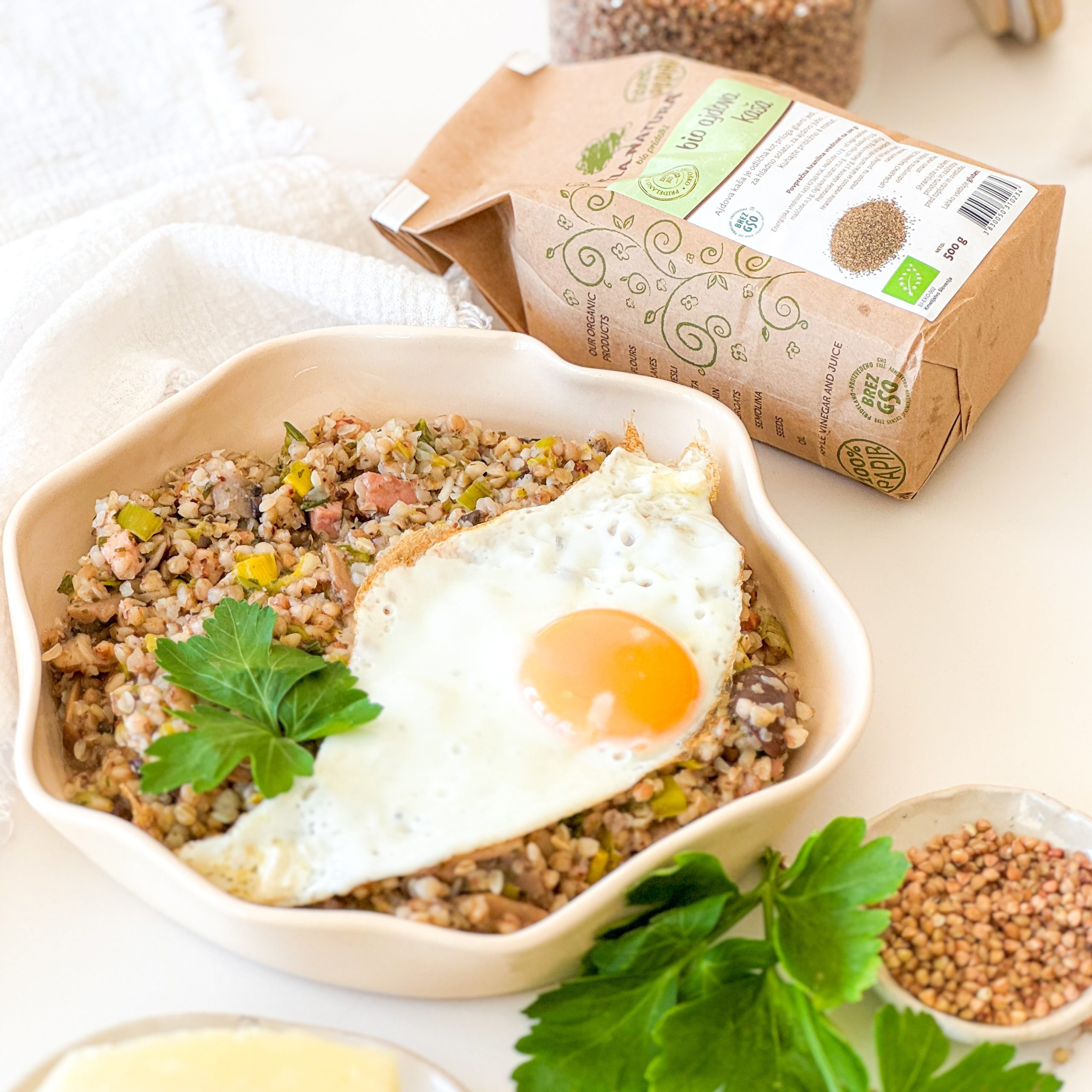 Recept je odličen primer, kako se ajdova kaša dobro obnese ne le kot priloga glavni jedi, pač pa je lahko z zanimivimi dodatki odlična tudi za zdrav in hranljiv zajtrk. Močan okus in aroma ajde se lepo ujemata z gobicami, slanino in porom, ki smo ga uporabili namesto čebule ter jajcem na oko, svežimi zelišči in parmezanom.