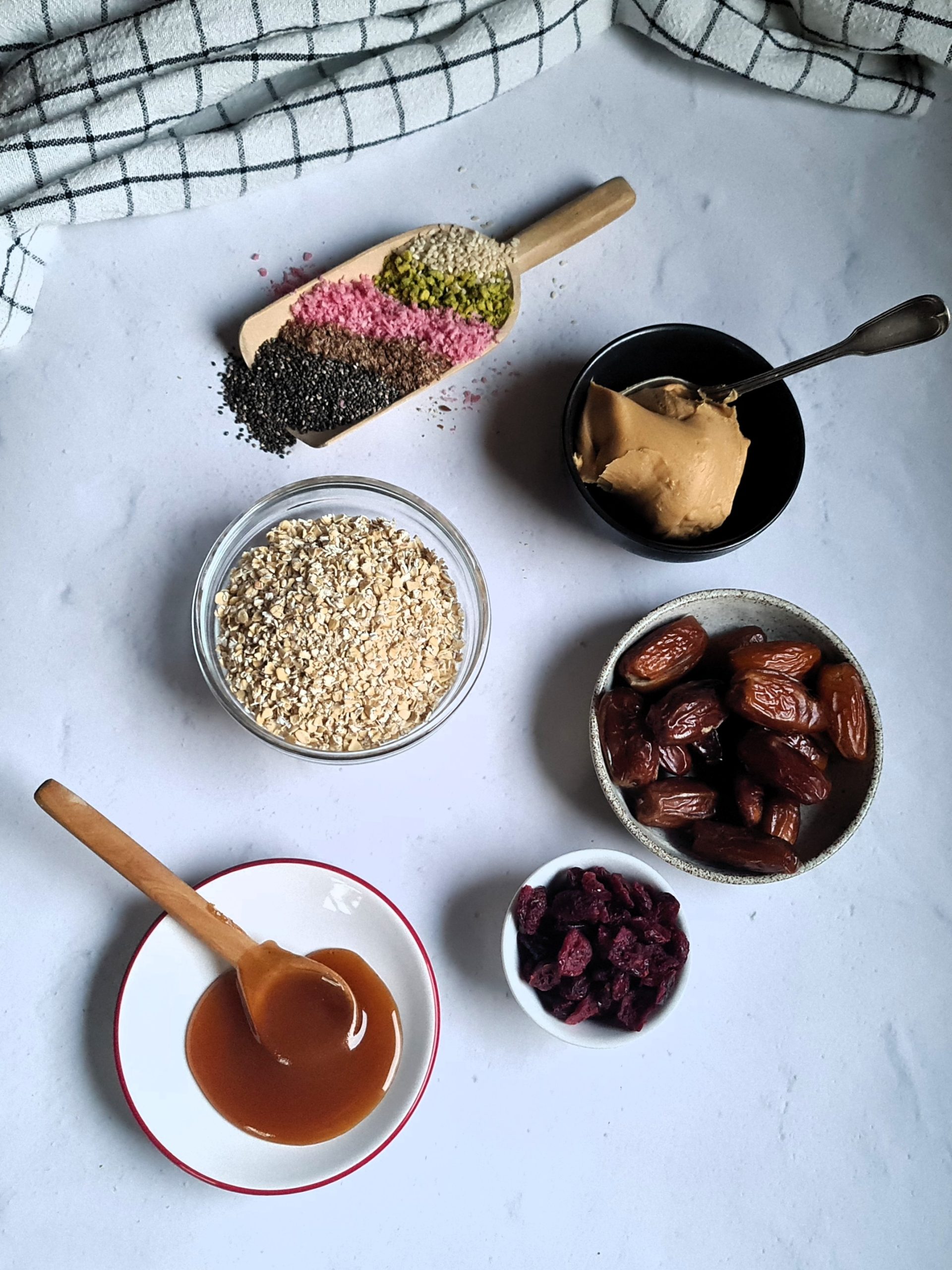 Od suhega sadja so odlični datlji, brusnice ali marelice. Fino je, če dodamo kako maščobo npr. arašidovo ali kokosovo maslo; manjkati pa ne smejo tudi začimbe kot sta vanilja ali cimet. Obvezno pa kroglice potrebujejo še sestavino, ki bo vse sestavine povezala skupaj npr. med, javorjev ali agavin sirup.