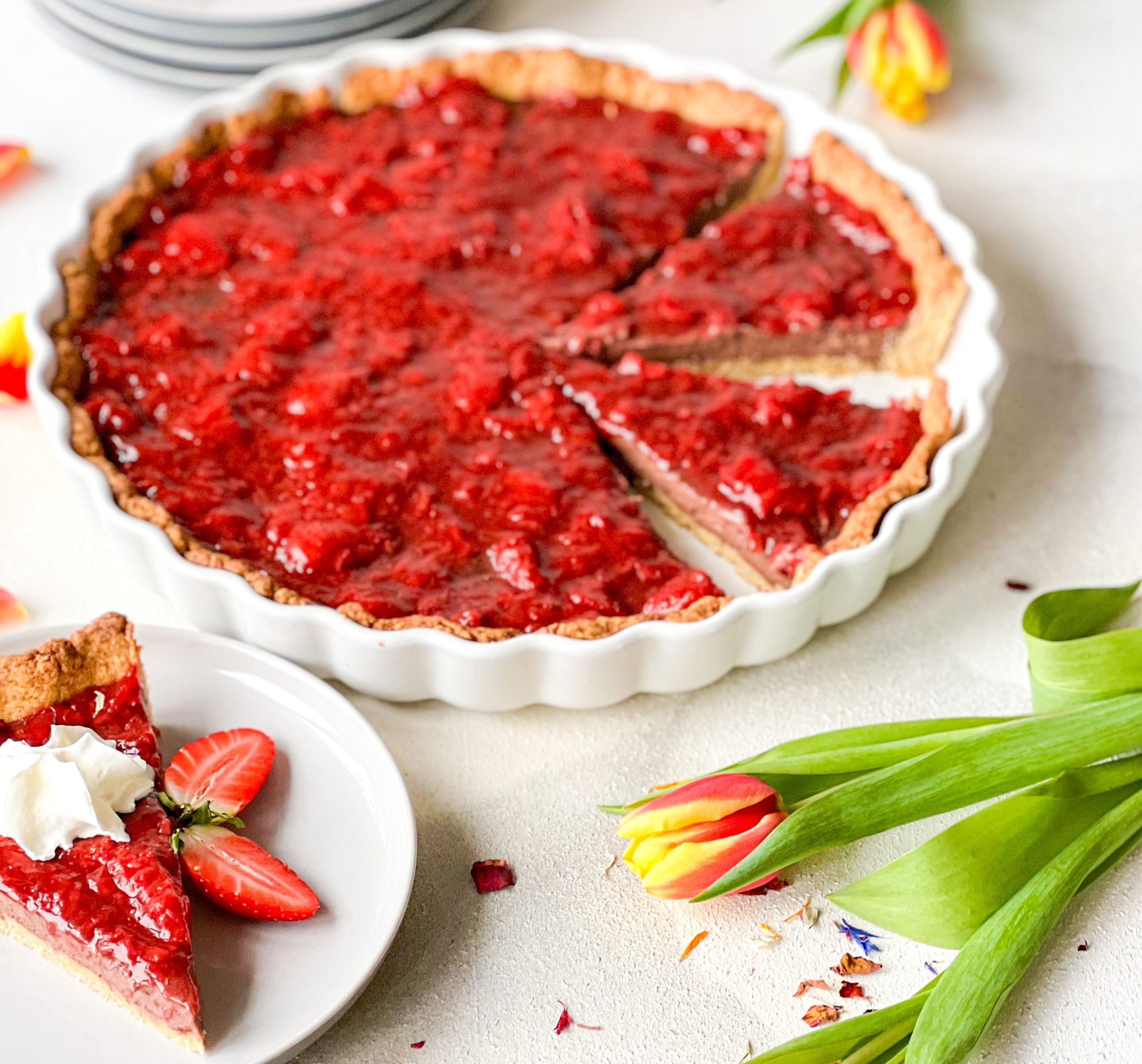 Čokoladna pita z jagodami iz enozrnice je prava kraljica pomladne mize. Hrustljava osnova iz moke iz enozrnice prinaša nežen oreškast okus in bogato teksturo, ki se čudovito ujame z žametno temno čokolado. Na vrhu pa čudovita jagodna krema in sveže, zrele jagode. Ravnovesje med bogatim čokoladnim okusom in lahkotnimi jagodami ustvari pravo spomladansko čarovnijo. Zdravo, a nič manj božansko.
