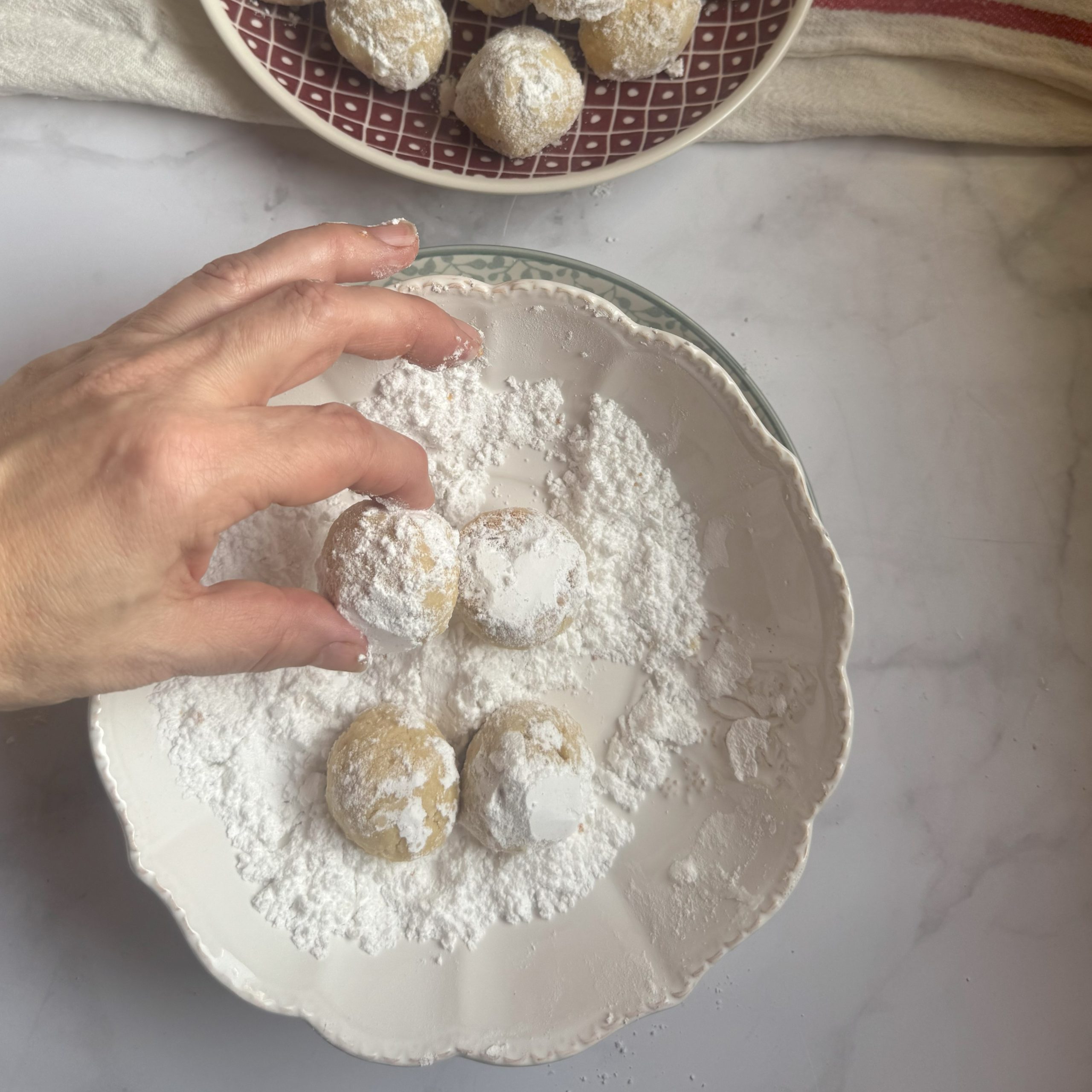8. Rahlo tople kekse povaljajte v sladkorju v prahu. Na rešetki ohladite do konca in jih hladne povaljajte še enkrat.